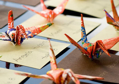 用富有東方韻味的花紋紙折成紙鶴,擺放在座卡之間,點綴設(shè)計簡約的座卡,也帶來美好的祝愿。