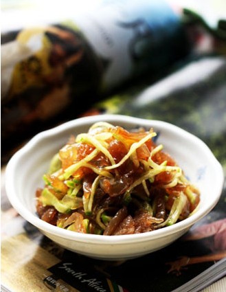 海蜇頭濾去水放大碗內(nèi),入80℃左右的沸水燙一下,立即將沸水瀝干