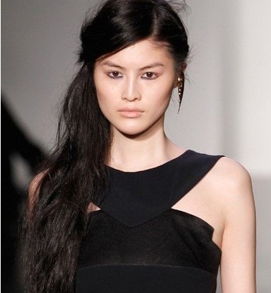 東方人的黑發(fā)色搭配松散側(cè)編,古典意味豐富。