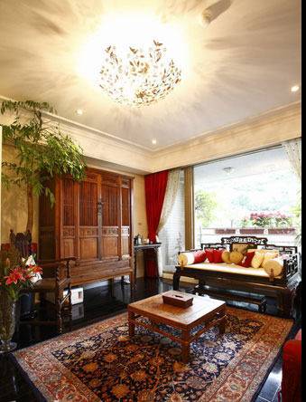 手工實(shí)木染黑地板與精致的波斯地毯,加上特色的古董家具便將整個(gè)客廳烘托出東方的華麗美感。 |