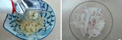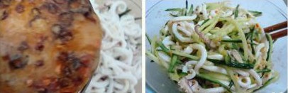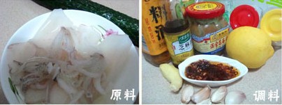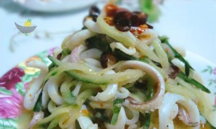 魷魚的營養(yǎng)價值頗高,脂肪含量卻極低,具有有滋陰養(yǎng)胃、補(bǔ)虛潤膚的功能,黃瓜清甜爽脆,加上芝麻花生醬的香濃、鮮炸辣椒油的香辣和檸檬汁特殊風(fēng)味,形成了一道營養(yǎng)健康的開胃涼菜。 原料: 魷魚1斤、黃瓜1條、蒜4粒、姜2片、料酒少許、精鹽少許、雞精少許、白糖少許、白醋2-4勺、芝麻花生醬3大勺、芝麻油3滴、辣椒油(現(xiàn)炸)適量、檸檬2-3滴。 做法: 1、將蒜用壓蒜器壓成蓉備用; 2、魷魚洗凈切成細(xì)絲備用; 3、黃瓜刨成細(xì)絲備用; 4、鍋中加入適量清水,放入姜片和料酒,燒沸時下入魷魚絲焯熟,魷魚卷曲即可,不超過一分鐘; 5、撈出過冷油,瀝干水份待用;