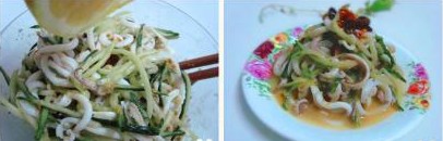 6、將黃瓜絲鋪在盤中,放上魷魚絲待用; 7、取一小碗,加入精鹽、雞精、白糖、白醋、芝麻花生醬、芝麻油、現(xiàn)炸辣椒油、適量溫水調(diào)勻(按同一方向攪拌)。 8、調(diào)好的醬料待用; 9、將醬料澆在魷魚、黃瓜絲上; 10、用筷子拌勻; 11、滴上2-3滴檸檬汁; 12、盛于盤中。 溫馨提示: 1、魷魚絲盡量切細(xì)一些。 2、過水焯魷魚絲的時候要把握好時間,這樣才能在品嘗到鮮甜的感覺。 |