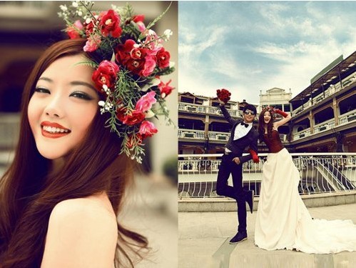 好萊塢少女 童話中的浪漫婚紗,是新娘內(nèi)心深處的甜美情結(jié):網(wǎng)眼薄紗演繹成輕盈可愛的蓬蓬裙,帶來少女一般的純真與夢幻,倒V字線分割出緞面心形裹胸,施華洛世奇水晶編織成的精致宮廷圖案,點綴在打褶薄紗上,配合自然合體的低腰線塑造出窈窕曲線,紅色皮革長靴映襯著紅潤雙唇,成就陽光下的艷麗印象,在斑駁的朱砂色木門前,沉淀出好萊塢式的懷舊風(fēng)情。 |