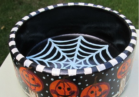 糖果盤內(nèi)里是用白色的蜘蛛網(wǎng)裝飾,糖果盤外面則將南瓜繪制成燈籠的樣子,給冷風吹襲的萬圣節(jié)中增加暖意。