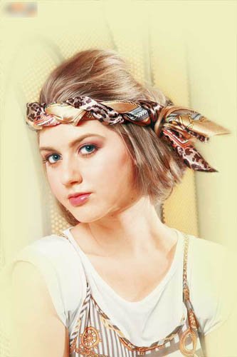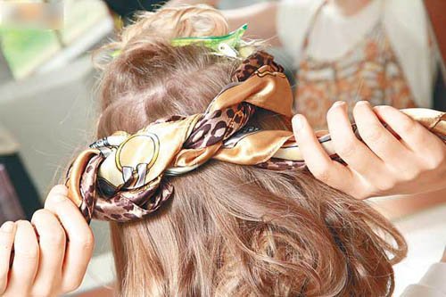 Step 2:將兩條絲巾卷細(xì)后扭成一條,圍住前額綁起。