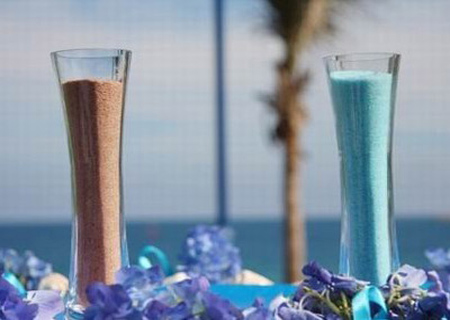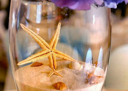 大?偸亲屓松裢煤Q蟮乃{色來裝點自己的婚禮,別致而富有情趣。世間贊美海的文章和詩句很多,可見大海是多么為人們所喜愛。人說大海是神秘的,讓我們把海洋世界搬到桌面,讓可愛的海星、貝殼、海螺、海馬、細沙……也來見證你們的愛情吧!