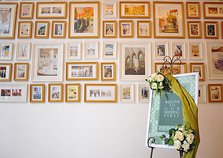 淡綠色的迎賓牌呼應(yīng)了花環(huán)和婚宴整體色調(diào),柔和的視覺感受讓人在溫婉中體味出愛情的雋永。