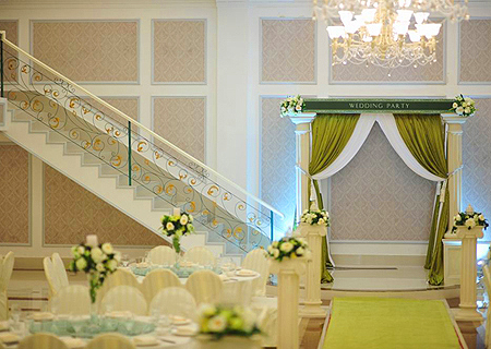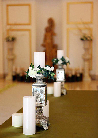 精細(xì)雕琢的工藝燭臺層層烘托出熒光閃閃的蠟燭,燭臺底座的托盤中,用和捧花相同花材環(huán)繞出的雅致花環(huán),組成別具一格的桌面裝飾。這樣別致的裝飾小品,在這里隨處可見。