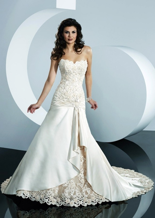 款式建議:鏤空的蕾絲花邊、綴滿花朵的蓬裙還有長長的頭紗。