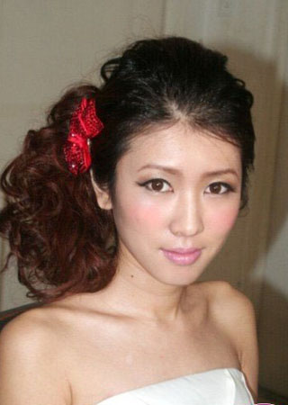 紅色發(fā)飾搭配蓬松波浪日式蓬松馬尾辮,喜慶浪漫。