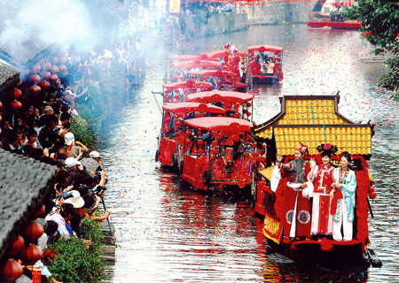 擲 扇:禮車啟動后,新娘應(yīng)將扇子擲到窗外,意謂不將壞性子帶到婆家,小男孩將扇子撿起后交給女方家人,女方家人回贈紅包答謝。