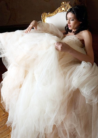 Angelina Colarusso的這款婚紗靠膚色系的薄紗俘虜?shù)谋姸嗑W(wǎng)友。純白的婚紗固然漂亮,但如果新娘的膚色是比較健康的,純白的婚紗倒凸顯不出健康的感覺,膚色的婚紗也適合小個(gè)性的新娘。