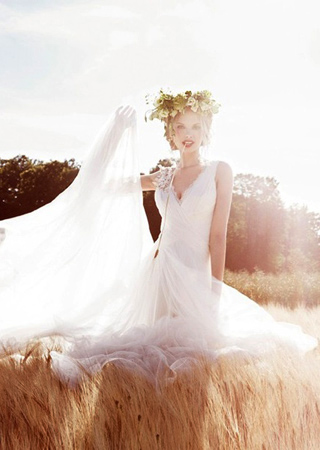 Jenny Packham的婚紗可是相當(dāng)昂貴。這條婚紗的美麗意境通過攝影師的鏡頭淋漓展現(xiàn),大逆光外加自然的小麥,烘托出了婚紗的簡潔與隨意,難怪成為眾多網(wǎng)友討論的對象。