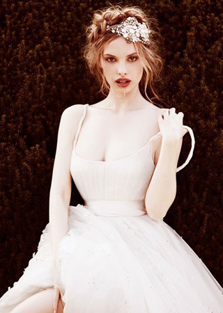 還是Jenny Packham!只怪模特太美,婚紗太性感。這條婚紗的設(shè)計(jì)簡潔到的極致,沒有任何鉆石也沒有任何額外的裝飾,但卻給人以芭蕾舞少女般的優(yōu)雅。