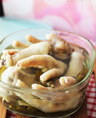 9、將雞爪放在用熱水燙過(guò)的干凈容器中