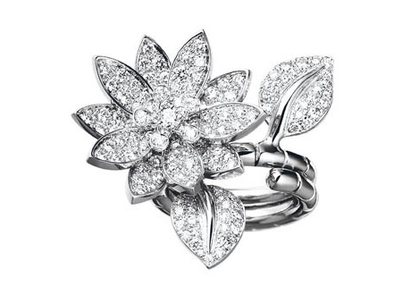 Van Cleef & Arpels Lotus 鉆石指間戒 Van Cleef & Arpels與蓮花 Van Cleef & Arpels的Lotus 鉆石指間戒,數(shù)顆精致切割的鉆石鑲嵌在盛開的蓮花花瓣、花蕊以及舒展的枝葉之中,材質(zhì)奢華卻在簡潔的設(shè)計(jì)中透出清新素雅的味道。