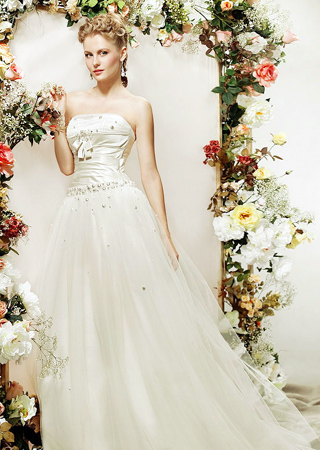 露肩禮服,珍珠雨宛如純凈的水滴灑落在婚紗上。