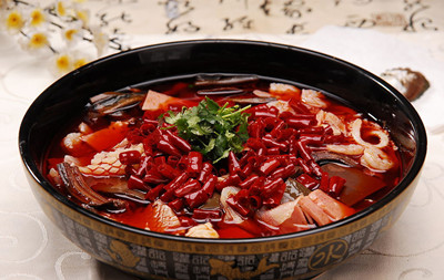 主料:嫩豆腐1250克,黑魚500克,海米25克,夾心豬頭250克,水發(fā)香菇50克,冬筍,150克,塔菜心250克。 調(diào)料選用:黃酒25克,精鹽10克,味精5克,蔥姜末30克,豬油50克,肉湯1250克。 做法: 1、用刀將嫩豆腐剖成3厘米見方的塊,放入搪瓷盆內(nèi),加少量清水,放進(jìn)冰箱(-18度)內(nèi)速凍,5小時后即成凍豆腐。取出自然化凍待用。 2、塔心菜洗凈,瀝干水分;冬筍削去毛衣,切成3厘米長、1.5厘米寬的薄片;香菇剪去根、蒂洗凈;海米洗凈后放入碗內(nèi),加黃酒(5克)、清水(25克),上蒸籠蒸30分鐘,取出待用。 3、將黑魚刮去鱗,開膛挖去內(nèi)臟,去腮洗精斬去魚頭,剔除脊背骨,成精魚肉條。在切成長3厘米、寬1.5厘米的薄片,放入盤中。 4、燒熱鍋,放開水和凍豆腐,燒滾后,倒入漏勺,瀝去水分;熱原鍋,去水下入豬油、蔥、姜末熗鍋,烹黃酒,加肉湯、夾心肉塊,煮熟后取出,切成長4.5厘米、寬1.5厘米的薄片;將黑魚頭、脊背骨放入原湯中,燒滾15分鐘,即用漏篩濾去魚渣,棄之不用,再放香菇、肉片、海米、魚片、凍豆腐塊、冬筍片,燒滾后,撇去浮沫,加鹽、味精、黃酒,倒入火鍋內(nèi),最后放塔菜心,即可上桌,點燃火鍋食用。 |