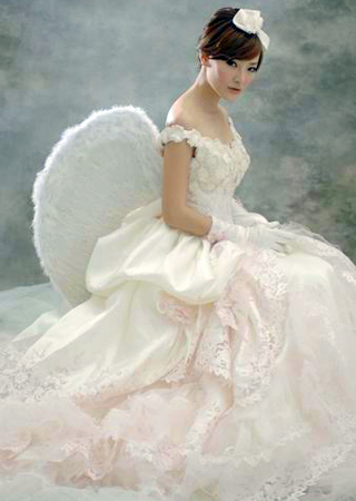 精致的淺粉色蕾絲婚紗與閃爍的翅膀配飾,搭配胸前朵朵鑲邊花朵。