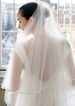 點評:雙層紗的搭配會讓你瞬間擁有公主般的尊貴感,長紗拖地,質地可以輕薄,頭紗部分可以華麗,綴珠鑲水鉆都可以,為的就是華麗再華麗。