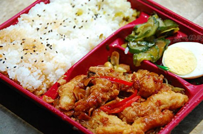 主料:洋蔥一個,肥牛片半包,西蘭花半個,熱米飯一碗, 調(diào)料:白糖四勺,醬油,料酒,紅酒,雞精,少量水。 做法: 1、水燒開,放入西蘭花略煮斷生即可。 2、白糖四勺,放在鐵鍋里用微火燒成糖漿。 3、碗里加醬油、料酒、紅酒、雞精、少量水。一起倒入糖漿,燒開后加切成絲的洋蔥。 4、蓋上鍋蓋,燒開。然后把肥牛片一片一片鋪入。 5、然后一直用中火燒啊燒啊,燒大約八至十分鐘,燒到汁水幾干就ok了。 6、裝盤,將鍋中的牛肉片均勻的倒在熱米飯和西蘭花上即可。 三杯雞便當