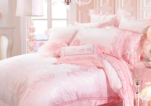 柔美的粉色溫潤典雅,大小相間的玫瑰提花底紋,溫馨而甜蜜,完美展示了女性的細膩與溫柔,同時寓意著婚姻生活的甜美和浪漫。