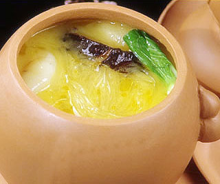 主料:豬肘肉100克,帶骨雛雞肉100克。雞蛋60克,火腿25克,青菜心25克。醬油20克,清湯100克,蔥段15克,姜片10克,精鹽5克,味精1克,菜油100克。 做法: 1、豬肘肉、帶骨雛雞肉均剁成3.3厘米見方的塊,放入開水鍋中氽過,取出放入砂鍋內(nèi)。 2、雞蛋煮熟剝?nèi),沾勻醬油。放入油鍋中炸成金黃色撈出,擺入砂鍋的四周,火腿、青菜心均切成小象眼片。砂鍋內(nèi)放入清湯、紹酒、蔥段、姜片、精鹽,旺火燒開后,移至小火燉至酥爛,取出蔥段、姜片、放入火腿片、青菜心略燉。撇去浮油,放入味精,淋上雞油即成。 |