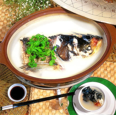 材料:鰱魚頭1/2個,雞蛋3顆,大白菜1顆,肉片70克,鮑魚菇50克,盒裝豆腐1盒,姜20克,蔥3根,高湯1000㏄,米酒2大匙,鹽1小匙,雞精粉1小匙,白胡椒粉1/2小匙 做法: 1.魚頭洗凈瀝干,魚頭兩面撒上少許太白粉;雞蛋打散;蔥洗凈,切段;姜去皮,切片備用。 2.熱一鍋油至約180℃,將魚頭炸至表面金黃撈起,再將雞蛋用漏勺漏入油鍋中炸成蛋酥備用。 3.大白菜切大塊,鮑魚菇切斜片,用開水汆燙過,依序放入火鍋中。 4.再將魚頭放入作法3鍋中,最后再鋪上蛋酥、豆腐及肉片。 5.熱鍋放入少許油,小火爆香蔥、姜,加入高湯及調味料,煮開后挑去蔥姜,再將高湯倒入火鍋中,整鍋火鍋煮開后小火滾約10分鐘即可。 |