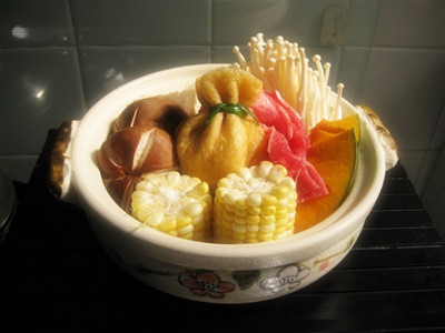 材料:大白菜適量,玉米2段,豆腐3片,南瓜2片,金針菇1小包,鮮冬菇2朵,油豆腐小福袋1-2個,火鍋牛肉片適量,日式芝麻醬蘸料1小碗,(咸芝麻醬2勺+1勺冷開水+半勺醋+少許糖) 做法: 1.先來做豆腐福袋。油豆腐用搟面棍壓一壓,放入開水中汆燙去油,擠干水分,剪去一個邊,中間放入糯米制的年糕,口部用燙過的香菜梗、小蔥葉或繩子札緊。 2.各種蔬菜切洗準(zhǔn)備好,鍋中先放白菜墊底, 3.然后逐樣放入所有材料,加入清水煮 ,約10分鐘左右材料熟后,最后加入火鍋牛肉片略煮,即可關(guān)火端上桌沾著芝麻醬開吃了。 |