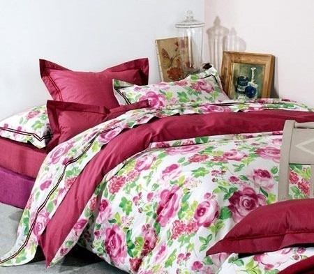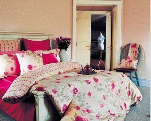 粉紅的花朵和朱紅的床單讓人感覺濃烈的浪漫鋪天蓋地而來,擺設(shè)的玫瑰花暗示著愛情。