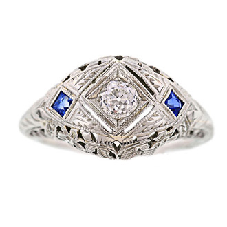這款新娘婚戒的設(shè)計感很強,小顆粒藍(lán)色的鉆石與中間的花朵鉆石相呼應(yīng),具有復(fù)古感設(shè)計的新娘婚戒將新娘的指間襯托的更加具有一種迷人的奢華感,將新娘的美麗完美的展現(xiàn)出來。