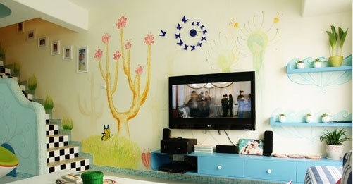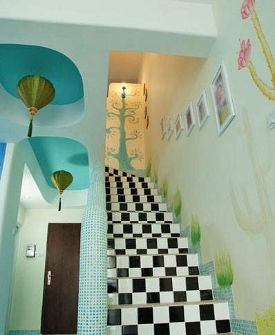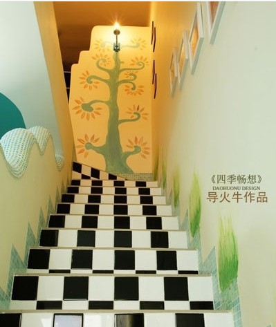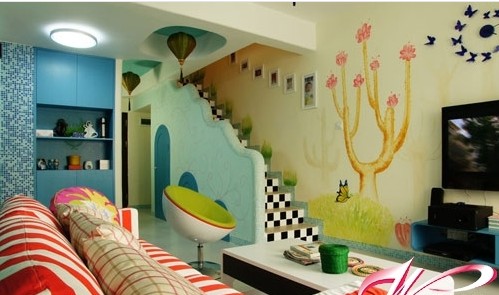 魔幻風(fēng)格客廳 海水層次漸變墻,魔幻風(fēng)格手繪圖案,手繪馬賽克樓梯,魔幻般的空間盡收眼底。亮綠色蛋形椅也增加了空間的趣味性。 利用跳色家飾營造空間趣味 波浪形狀樓梯扶手,紅白條紋沙發(fā)和藍(lán)白條紋沙發(fā),讓空間感更有跳躍性。沙發(fā)背景墻做成藍(lán)色漸變墻,海水的層次感移到了客廳。 手繪電視背景墻 客廳結(jié)合了許多手繪,電視背景墻大量采用手繪,豐富了視覺效果,且并不顯得凌亂。 弧形樓梯手繪墻 弧形樓梯墻面也大量采用手繪裝飾,在樓梯墻面上用相框做裝飾,很有特點。在上下樓梯的過程中同樣能欣賞到家人的照片和美景。 弧形樓梯扶手、凹面圓形吊頂、拱門 弧形樓梯扶手、凹面圓形吊頂和拱門,拒絕直來直去的線條,圓潤美在這里呈現(xiàn)。 |
