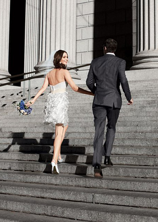 穿短婚紗去注冊登記,其實在西方社會文化里也是頗為得體的選擇。我們在亦舒小說里都經(jīng)常可以看到,新娘子穿了象牙色蓬裙,戴一枚小小發(fā)網(wǎng),遮住眼睛。或者,新娘子沒有穿禮服裙,穿了珍珠白套裝,戴一串大溪地珍珠項鏈,唔~~~