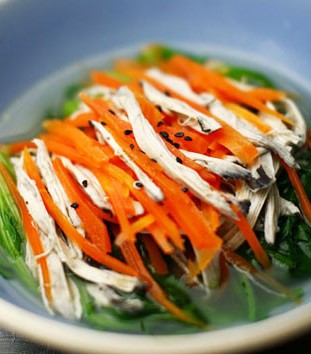 4.湯鍋中倒入雞湯煮沸,放入胡蘿卜絲和菠菜煮熟,加適量的鹽和雞精,最后加入雞絲裝盤即可