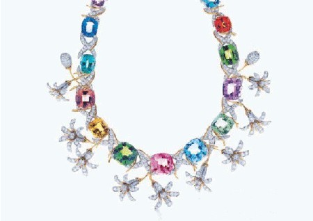 集合了來自世界各地的所有16顆彩色寶石的茉莉花項鏈,9朵茉莉花與16顆炫麗寶石相映成趣。