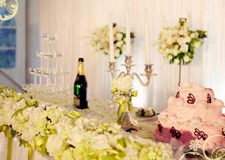 4、儀式區(qū):舉行隆重婚禮的舞臺。無論是傳統(tǒng)的中式婚禮,還是西式教堂婚禮,儀式都是正;槎Y的核心部分。新人在這里向大家訴說他們幸福的愛情,交換愛情信物,喝交杯酒,最后向來賓們宣布他們即將結(jié)為夫妻。