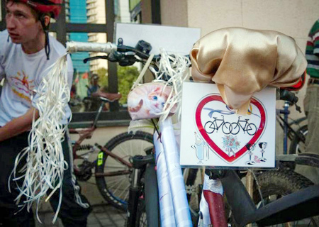雖然自行車簡單,但婚車的裝飾不可少,掛上自己和心愛人的名字,貼上大大的愛心,告知全世界我們的幸福。