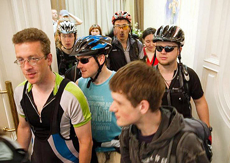 伴郎伴娘和來賓們的安全頭盔很搶眼,特殊婚禮上的特殊裝飾。