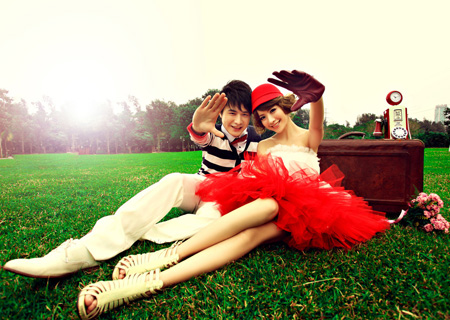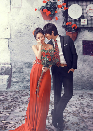 這是飯店或者賓館大堂常見的光線。這種光線的特點是稍顯昏暗,柔和,并且以紅色為基調(diào)。所以,新娘應(yīng)該選擇鮮亮豐富的色彩來起到突出的作用。 |