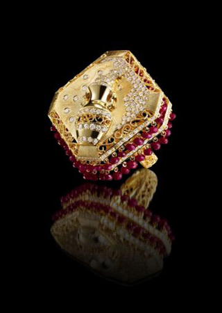 這款新娘婚戒很有高貴華麗的感覺,融合鉆石,黃金還有珍珠,顏色也很亮麗,款式設計的很精致,將酒瓶形狀鏤空刻在上面,四周鑲滿小顆粒的鉆石,紅色的珍珠繞在四方形的環(huán)戒一圈。將新娘的指間襯托的無比的優(yōu)雅。