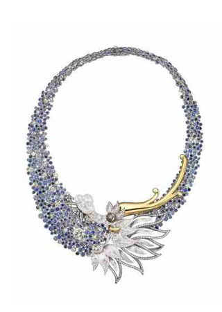 這款新娘項(xiàng)鏈很有設(shè)計(jì)感,藍(lán)色的小顆粒鉆石鑲在鉑金的項(xiàng)鏈外圈,中間的一只比翼鳥(niǎo)形狀特別的精致,黃金的裝飾讓整只比翼鳥(niǎo)變的靈動(dòng)起來(lái),比翼鳥(niǎo)的羽毛使用鉑金的材質(zhì),這款高貴項(xiàng)鏈將新娘的頸間襯托的無(wú)比的亮麗。