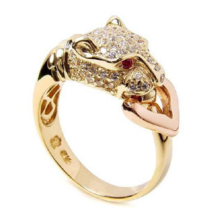 金色宛如動(dòng)物形狀設(shè)計(jì)的新娘婚戒,小顆粒的鉆石密集的鑲嵌在動(dòng)物的頭上,婚戒的戒環(huán)上面精細(xì)的雕鐲體現(xiàn)了這款新娘婚戒的奢華高貴迷人光彩。