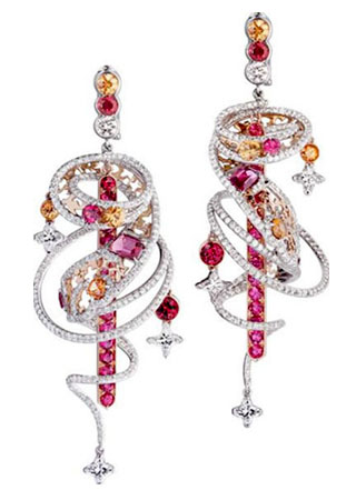 完美畫面一:藍調(diào)誘惑細數(shù)舉案齊眉 藍色腕表+枕形藍寶石戒指+彩石花形耳環(huán):沉靜,獨一無二的知性氣質(zhì)新娘。 瑰麗奪目的神秘午夜藍鉆石腕表,38mm表盤,瑞士機芯,幽藍的水晶以及鉆石的點綴,這款藍色珠寶表典雅而具有懾人心魄的美麗。藍色沉靜而輕柔的氣質(zhì)與指尖的藍寶石戒指以及藍寶石花的耳環(huán)共同點明了一個主題,新娘的嫻靜超然,如水晶般無瑕閃耀。 獨一無二的黃金耳環(huán),鑲嵌4顆圓形切割鉆石、14顆彩色梨形藍寶與碎鉆,彩色鉆石的耳環(huán)搭配平衡了首飾配戴中色彩的層次感,在整套藍色系的寶石裝扮中,中和了知性氣質(zhì),為婚禮時的甜美柔和氣質(zhì)加分。 |
