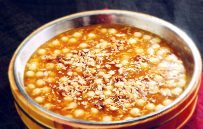 材料:水磨糯米粉(或買現(xiàn)成的速凍小圓子),甜酒釀(超市買的圓盒或小方盒裝的),枸杞,糖桂花,白糖,水淀粉 做法: 1 水磨糯米粉和熱水以10:7的比例分次加入60度熱水拌勻,和成軟硬適中的面團(tuán); 2 將面團(tuán)搓成長條,揪成小塊稍稍搓圓成糯米小圓子; 3 甜酒釀用筷子撥散使米粒大致分開備用; 4 湯鍋中加入適量水,水煮開后,放入小圓子,煮至小圓子都浮上水面; 5 倒入甜酒釀、枸杞,加糖調(diào)味,加少許水淀粉勾薄芡,待湯水再次燒沸后淋上糖桂花即可。 |