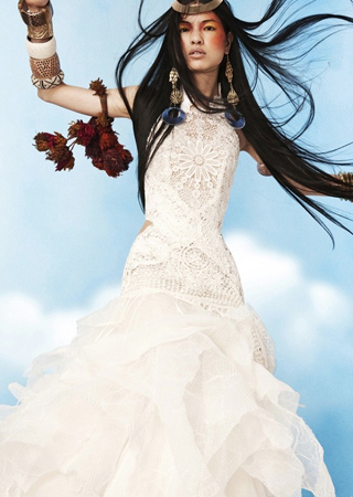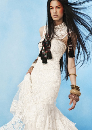 圓領立領的領口處鑲滿圓潤的珍珠,蕾絲與抹胸的拼接使簡單的婚紗款式看起來別具一格。頭上垂下的長線民族風流蘇則使新娘多了份灑脫與靈動。