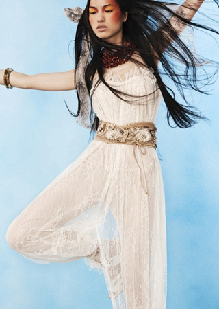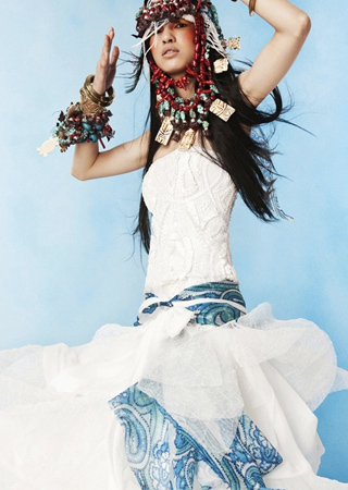 : 西藏風(fēng)情,中國元素蔚然呈現(xiàn),除去滿目琳瑯的夸張飾品,細(xì)看這組婚紗設(shè)計(jì),繁復(fù)蕾絲的精巧設(shè)計(jì)光彩奪目,此般復(fù)古風(fēng)情是不是能夠打動(dòng)你的心呢?
