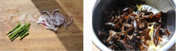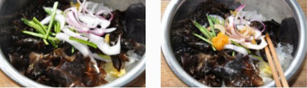 木耳和銀耳各1小把、蒜苗絲和洋蔥絲少許,鹽、糖、雞精、干貝露、剁椒醬、醋、香油、芥茉油各適量。