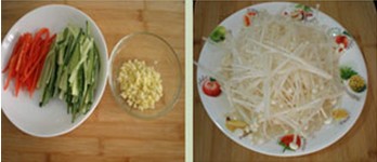 原料:金針菇150克、黃瓜100克、紅柿子椒15克、生姜、大蒜、辣椒油、生抽、醋、芝麻油各適量。