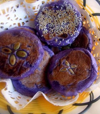6.用紙巾抹油少許在熱鍋上,放入紫薯餅,小火慢慢將餅煎成兩面金黃色,即可