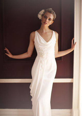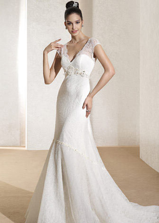 盤(pán)發(fā)高聳頭頂使臉看起來(lái)很小,而深V的婚紗又在視覺(jué)上拉長(zhǎng)頸部,這樣搭配讓新娘顯得高挑。
